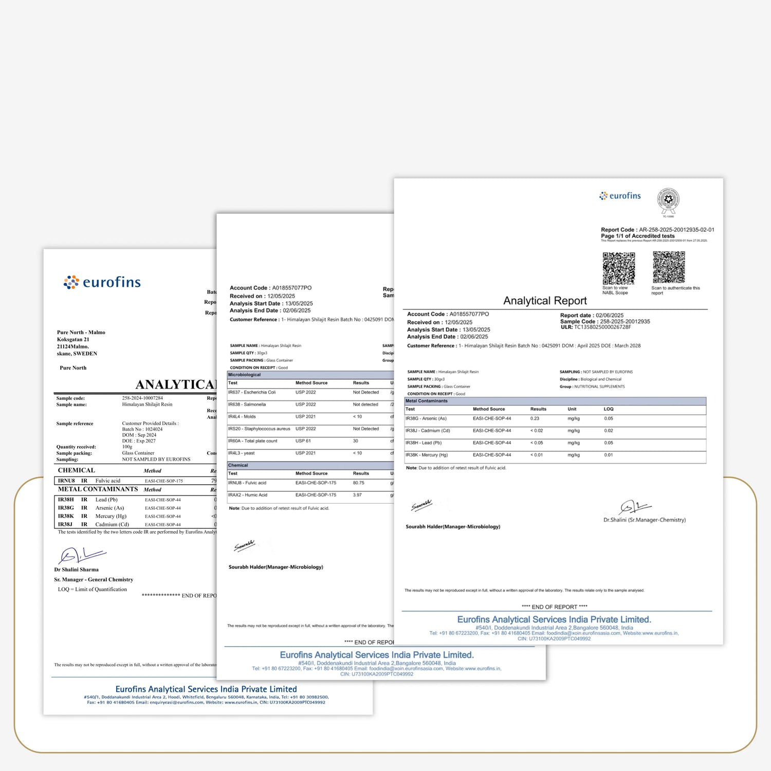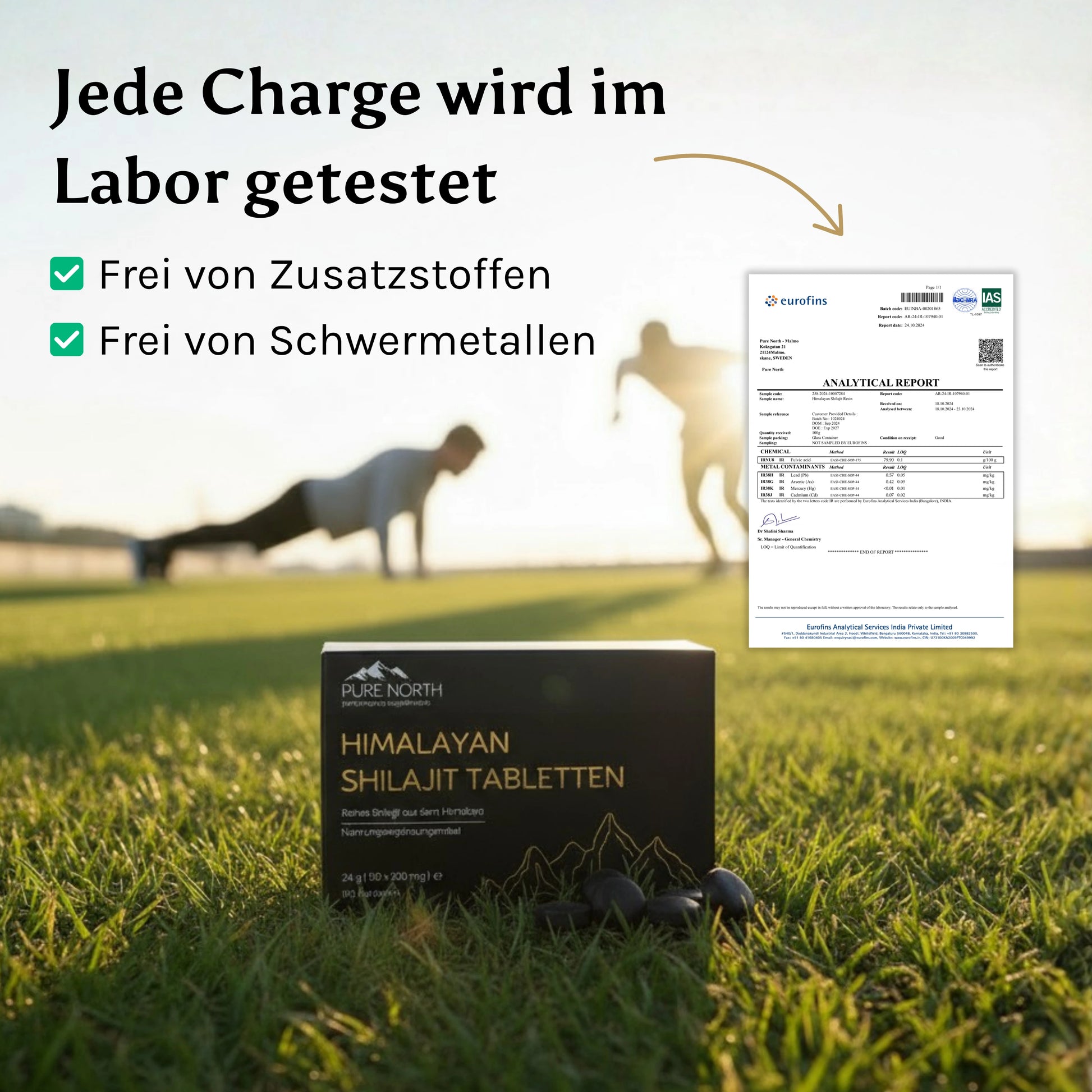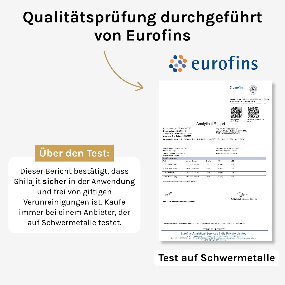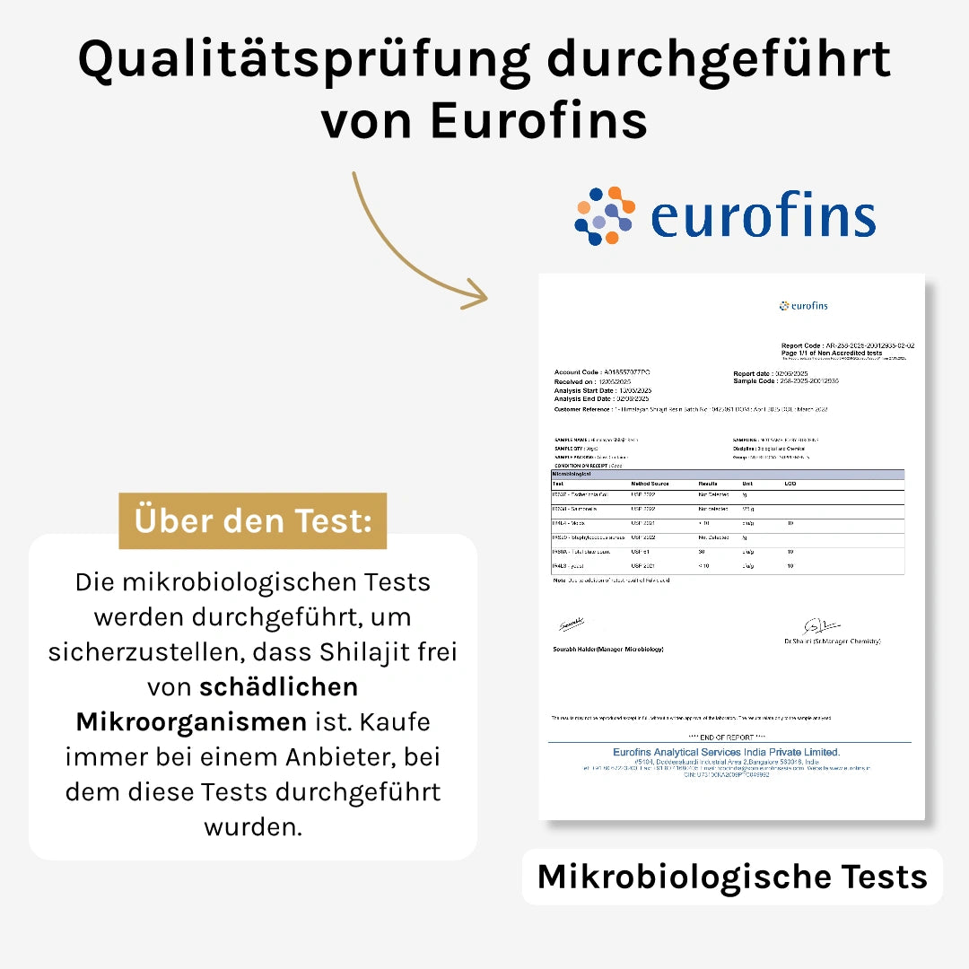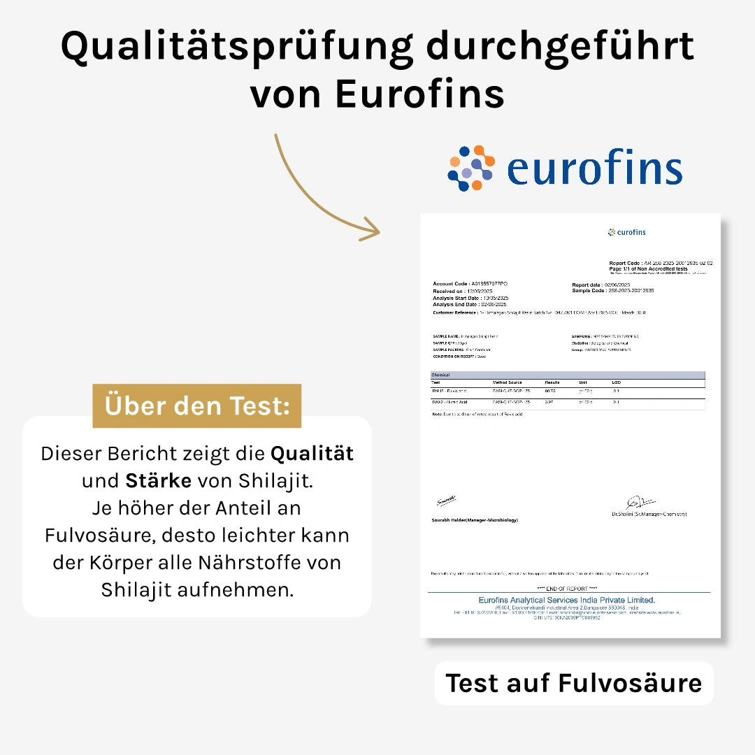 Die Labortests für unser Shilajit werden von Eurofins durchgeführt, einer der weltweit größten Laborgruppen für chemische und mikrobiologische Analysen.